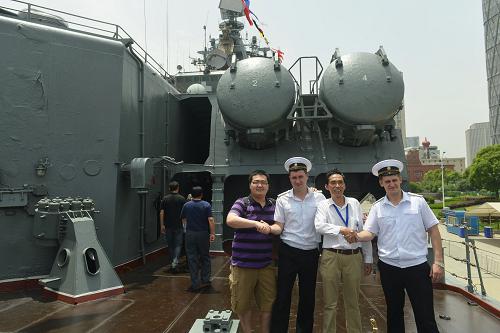 5月26日,参观者在“瓦良格”号导弹巡洋舰上与俄罗斯水兵合影。新华社发(龙巍 摄)