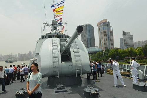 5月26日,人们在“瓦良格”号导弹巡洋舰旁等待上舰参观。当日,刚刚结束中俄“海上联合—2014”军事演习的中方指挥舰郑州舰和俄方指挥舰“瓦良格”号导弹巡洋舰亮相上海国际客运中心码头,向市民开放参观。新华社发(龙巍 摄)