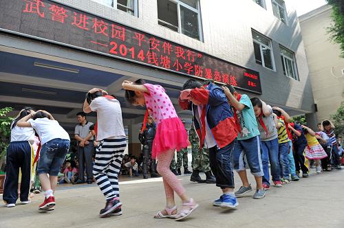 5月27日,武警战士为福州市鼓楼区钱塘小学的师生们演练制服持匕首的“恐怖分子”。当日,武警福建总队直属支队特战队官兵来到福州市鼓楼区钱塘小学,针对爆炸、恐怖袭击等暴力事件,从自身防护、寻求躲避物、紧急疏散、制服暴恐分子等方面,为3900多名师生上了一堂生动的防暴恐教育课。新华社发(李涛 摄) 5月27日,福州市钱塘小学师生演练遇到爆炸袭击时紧急有序地疏散。新华社发(李涛 摄) 5月27日,武警战士为福州市钱塘小学的老师们示范摔擒技术。新华社发(李涛 摄) 5月27日,武警官兵为福州市钱塘小学的师生们示范室内遭到爆炸袭击时的自我防护方法。新华社发(李涛 摄) |