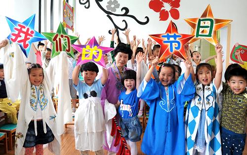 5月28日,扬剧艺人夏桂兰(右二)在教幼儿园的小朋友表演扬剧。新华社发(庄文斌 摄)