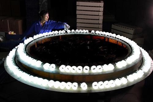 5月29日,在江西省靖安县工业园区,江西合力照明电器有限公司的员工在组装稀土三基色高效照明节能灯。 近年来,江西省绿色照明产业基地靖安县依托当地丰富的稀土资源,大力发展稀土三基色高效照明节能灯产业。今年前4个月,生产节能灯1.6亿只,其中半数为稀土三基色高效照明节能灯,实现主营业务收入3.8亿元。稀土三基色高效照明节能灯是一种发光效率更高、使用寿命更长的新型电光源,它是在玻璃灯管内壁涂布稀土三基色荧光粉制成的节能灯。新华社发(徐仲庭 摄)