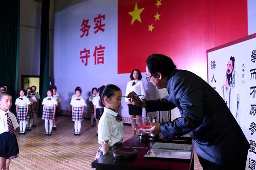 5月30日,在浙江省江山市廿八镇浔里村文化礼堂,老师在为学童点朱砂启智。浙江省自2013年以来,主要依托已有的祠堂、书院、文化活动中心等,在各地农村建起了1000多所集教学、礼仪、娱乐于一体的综合性文化礼堂,使其成为农民群众在家门口开展文化活动、传承文明、丰富精神文化生活的家园。新华社记者 金良快 摄