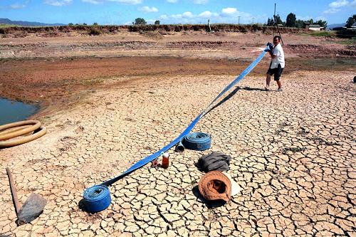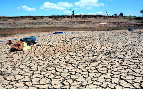 5月30日,一位农民从已渐渐干枯的庙街镇新庄库塘边走过。 新华社发(张树禄 摄)