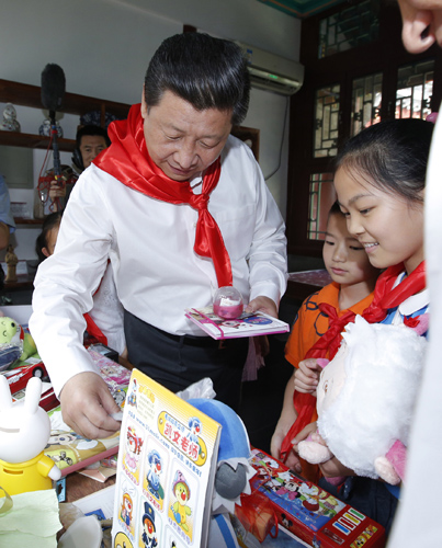 5月30日上午,中共中央总书记、国家主席、中央军委主席习近平来到北京市海淀区民族小学,参加庆祝“六一”国际儿童节活动。这是习近平与学生一起为帮助民族地区生活困难的小朋友进行爱心义卖活动。新华社记者 鞠鹏 摄 5月30日上午,中共中央总书记、国家主席、中央军委主席习近平来到北京市海淀区民族小学,参加庆祝“六一”国际儿童节活动。这是习近平观看学生书写的毛笔字。新华社记者 李涛 摄 5月30日上午,中共中央总书记、国家主席、中央军委主席习近平来到北京市海淀区民族小学,参加庆祝“六一”国际儿童节活动。这是习近平听学生背诵《弟子规》和《少年中国说》。新华社记者 李涛 摄 立人书院是校园内一座古色古香的四合院,也是学生们开展社团活动的场所。一品轩内,学生们正在举办“少数民族文化展”。总书记的到来使孩子们喜出望外,学生们纷纷当起小主人,介绍学校红领巾志愿者同青海藏族、贵州水族小朋友开展手拉手、献爱心活动的情况。一张桌子上,摆放着学生们今年“六一”儿童节送给藏族、水族孩子的书籍和他们写的信、画的图画,总书记走过去仔细观看,叮嘱小朋友再写信时捎上他的问候和祝福。一位学生热情邀请总书记参观他们的“爱心义卖角”,习近平挑选了3件小文具,把10元钱投进捐款箱,并在留言布上签名。 在墨韵堂,书法社团的学生们正在书写古训警句:与人为善、精忠报国、大公至正、诚信为本……习近平驻足观看,表扬他们写得好。他表示,书法是中华文化瑰宝,包含着很多精气神的东西,一定要传承和发扬好。 藏书阁里书声琅琅。习近平走进去,倾听学生们在老师指导下、伴着古筝乐曲朗诵的《弟子规》和《少年中国说》,肯定他们有激情、有气势,希望他们多从经典作品中汲取营养。