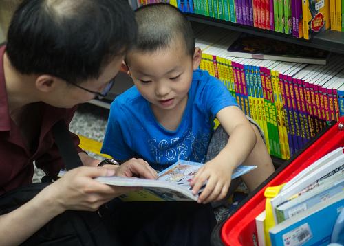 5月31日,一名小朋友和家长在北京图书大厦翻阅图书。新华社记者 罗晓光 摄