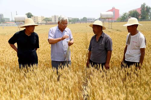 5月30日,在“渤海粮仓科技示范工程”河北沧州南皮示范站里,农技专家孙家灵(左二)正在指导农民。麦收即将到来,“渤海粮仓科技示范工程”河北沧州南皮示范站几位农技专家,来到示范田内,指导当地农民做好麦子收割前预防病虫害和干热风等影响小麦产量的工作。“渤海粮仓科技示范工程”重点突破区域土、肥、水、种等关键技术,拟在环渤海低平原区中低产区、盐碱荒地进行规模化示范粮食增产技术推广,挖潜增效,大幅提升这一区域粮食增产能力。新华社发(周洋 摄)