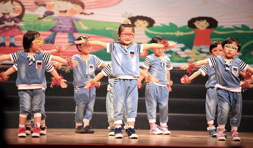 5月31日,山东即墨市即发幼儿园的小朋友们在表演歌舞《数鸭子 做饭饭》。新华社发(梁孝鹏 摄)