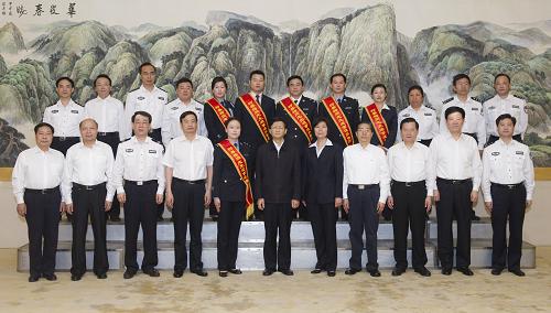 5月30日,江西省庐山管理局公安局原政委柯善梅同志先进事迹报告会在北京人民大会堂举行。报告会前,中共中央政治局委员、中央政法委书记孟建柱会见柯善梅同志亲属和先进事迹报告团成员。新华社记者 谢环驰 摄