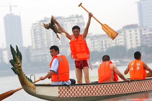6月2日,一名市民在遂宁市观音湖的龙舟上展示抢到的鸭子。新华社发(钟敏 摄)