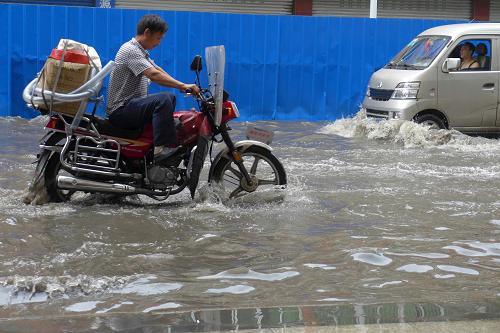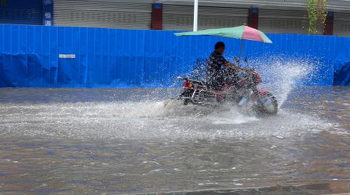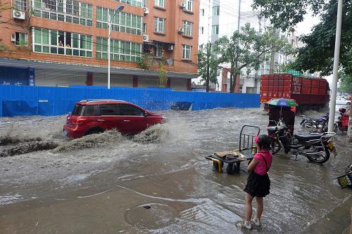6月2日,车辆在四川省南部县城区的积水街道上行驶。新华社发(张枥 摄)