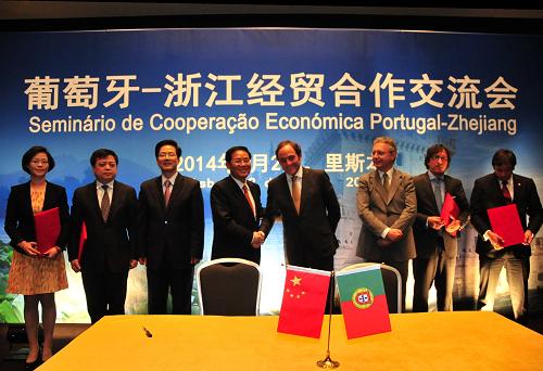 6月2日,葡萄牙副总理波塔斯(右四)与中国浙江省省长李强(左四)等出席葡萄牙-中国浙江经贸合作交流会。当日,葡萄牙-中国浙江经贸合作交流会在葡首都里斯本举行,由浙江省省长李强率领的浙江省经贸代表团和青年企业家代表以及葡萄牙政界和工商界人士等近百人参加了交流会。新华社记者 张立云 摄