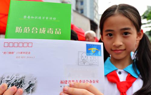 6月3日,福州市则徐小学五年级学生林静雯在展示免费领取的纪念虎门销烟175周年首日封和禁毒宣传手册。新华社记者 魏培全 摄 |