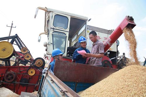 6月3日,在山东省桓台县果里镇西边村麦地里,山东桓台县供电公司员工向收割机司机发放《致农民朋友的一封信》。眼下正值麦收时节,山东桓台县供电公司的11支党员“三夏”服务队走进田间地头,检查配电线路,向麦收农民和收割机司机发放电力设施保护宣传材料,为群众解决用电问题,确保麦收用电安全。新华社发(孙丽梅 摄)