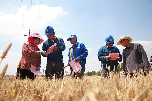 6月3日,在山东省桓台县果里镇西边村麦地里,山东桓台县供电公司员工向麦收农民发放《致农民朋友的一封信》。新华社发(孙丽梅 摄)