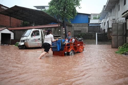 6月3日,人们在江安县四面山镇街头冒雨转移车辆。 新华社发 庄歌尔 摄