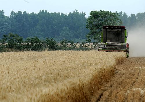 6月4日,收割机在河南长葛市老城镇耿庄村麦田里收割小麦。 新华社记者 李安 摄