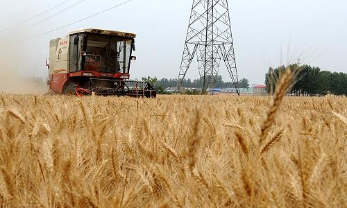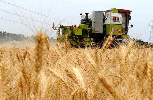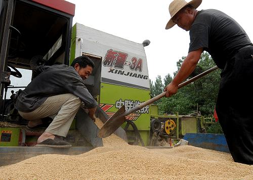 6月4日,河南长葛市老城镇耿庄村村民将收割的小麦收集装车。新华社记者 李安 摄 |