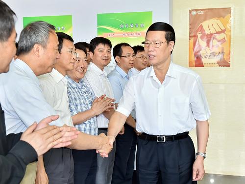 这是张高丽与科技工作者亲切握手交谈。 新华社记者 李涛 摄