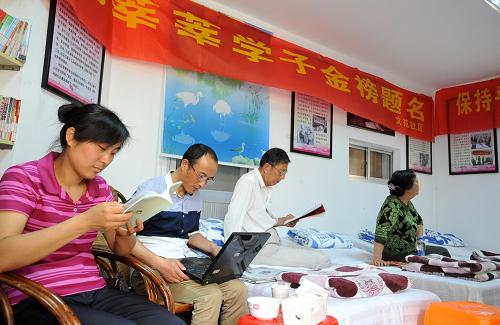6月7日,考生家长在江苏省扬州市文苑社区的“陪考驿站”休息。当日是2014年全国高考首日,江苏省扬州市考点附近的一些热心社区、企业等主动开设“陪考驿站”,为陪考家长提供茶水、WiFi等免费服务,让陪考家长倍感温暖。新华社发 庄文斌 摄