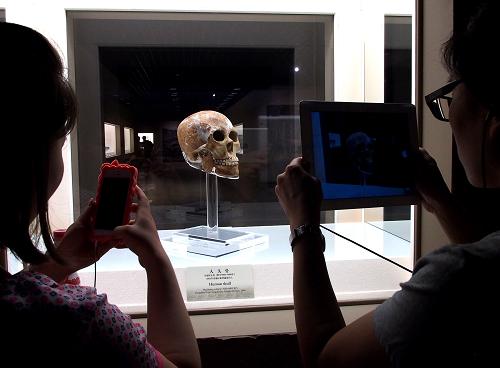 6月7日,游客在考古展上观看距今6000多年的成年男性头骨。新华社记者 陈飞 摄