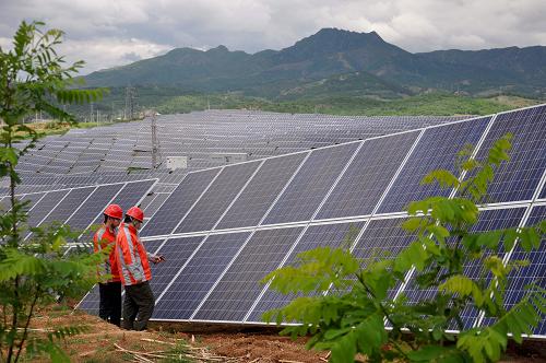 6月7日,河北平泉杨树岭光伏电站工作人员对供电光伏板进行测温。河北省承德市平泉县拥有一座占地约1300亩的光伏发电站——平泉杨树岭光伏电站。该电站总投资约3.4亿元、目前装机容量15兆瓦,自2013年12月31日并网发电以来,运行平稳,截至2014年6月5日,已并网发电约254万千瓦时。新华社发(刘环宇 摄)