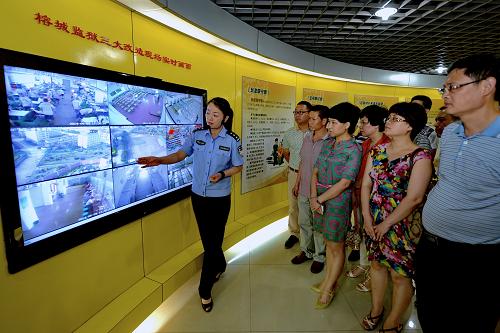 6月9日,罗源县纪检干部在榕城监狱通过监控平台观看服刑人员劳动改造情况。新华社记者 张国俊 摄 |