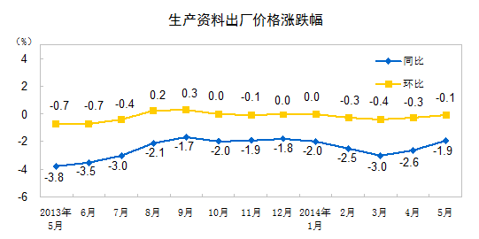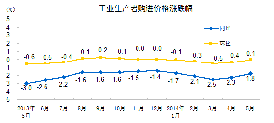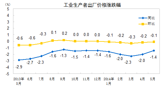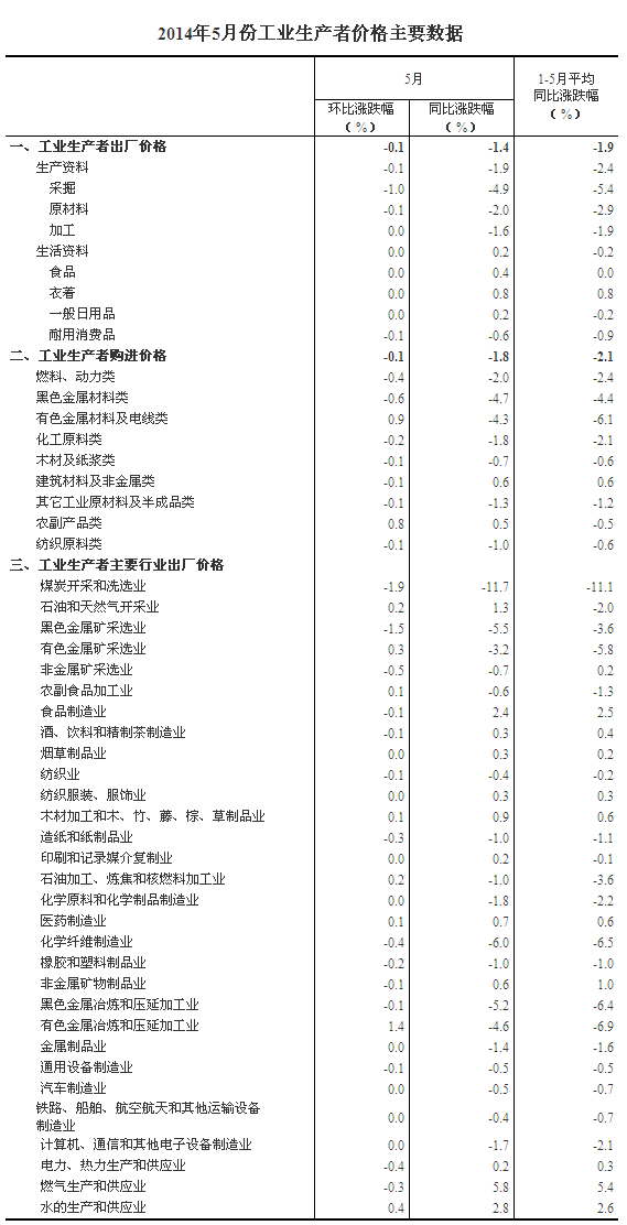 2014年5月份,全国工业生产者出厂价格同比下降1.4%,环比下降0.1%。工业生产者购进价格同比下降1.8%,环比下降0.1%。1-5月平均,工业生产者出厂价格同比下降1.9%,工业生产者购进价格同比下降2.1%。