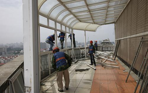 6月10日,工人在上海普陀区香山苑小区19号楼楼顶拆除违章搭建的阳光房。新华社记者 方喆 摄