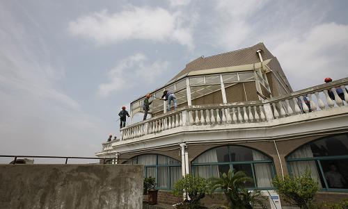 6月10日,工人在上海普陀区香山苑小区19号楼楼顶拆除违章搭建的阳光房。近日,上海香山苑小区的居民反映,该小区2号和19号两处高层居民楼存在顶楼违章搭建问题。当日拆除的是19号楼楼顶违章搭建的阳光房,2号楼顶的“豪华别墅”也将在下周彻底拆除。新华社记者 方喆 摄