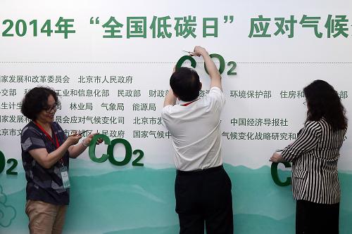 6月10日,出席第二届应对气候变化主题展览开幕式的嘉宾从背景板上剪下象征碳的“C”标识,留下象征氧气的“O2”标识,暗含“去碳留氧”的环保理念。当日是第二个“全国低碳日”,由国家发展改革委和北京市人民政府主办、以“凝聚低碳力量,共筑中国梦想”为主题的第二届应对气候变化主题展览在北京首都博物馆开幕。本届展览通过大量的图片和文字,分6个主单元全面展示全球气候变化成因与挑战、国际谈判与合作历程、我国积极应对气候变化的政策与行动,系统介绍低碳试点示范,呈现低碳生活美好未来。展览将于6月29日结束。新华社记者 沈伯韩 摄