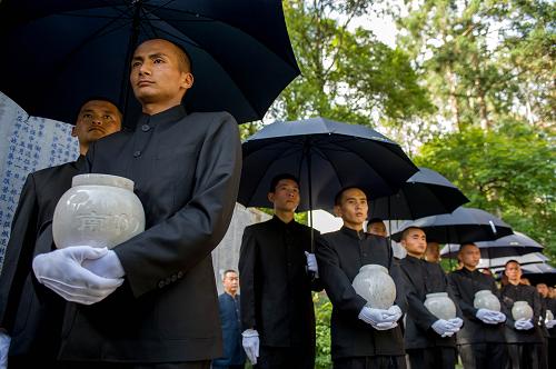 6月12日,在云南腾冲国殇墓园,身着黑色中山装的护灵者手捧骨灰罐肃立。 新华社发 (胡超 摄)