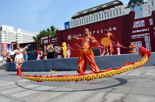 6月14日,艺人在北京表演抖空竹。当日,由文化部、中央文明办、民政部主办的2014文化遗产日主场活动在北京举行,活动分为视频展示、互动展示、图片展览三个部分。2014年6月14日是我国第九个文化遗产日。新华社记者 金良快 摄