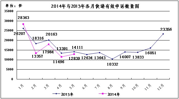 5月,国家邮政局和各省(区、市)邮政管理局通过“12305”邮政行业消费者申诉电话和申诉网站共受理消费者申诉44492件。申诉中涉及邮政服务问题的1675件,占总申诉量的3.8%;涉及快递业务问题42817件,占总申诉量的96.2%。已处理申诉中有效申诉(确定企业责任的)13115件,同比下降9.3%。有效申诉中涉及邮政服务问题的276件,占有效申诉量的2.1%;涉及快递业务问题的12839件,占有效申诉量的97.9%。经调解消费者申诉已全部妥善处理,为消费者挽回经济损失312.4万元,消费者对邮政管理部门申诉处理工作满意率为95.7%,对企业申诉处理结果满意率为92.3%。