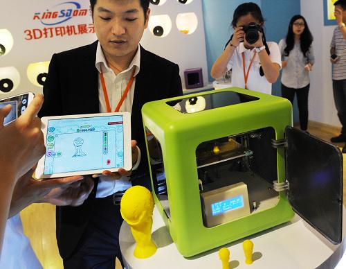 6月16日,工作人员介绍通过无线控制技术打印出的3D大力神杯模型。当日,我国首款教育普及型3D打印机在青岛发布。该打印机由青岛某企业耗时2年研发,具有完全自主知识产权,初期售价为4000元人民币左右,可通过无线网络实现远程控制,其在3D入门设备应用特别是中小学教学领域具有广阔的市场前景。新华社记者 李紫恒 摄