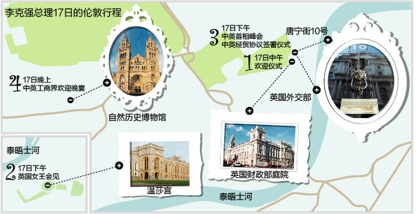 首相府的下午茶 在参加商务晚宴前,李克强还接受了当天中午由英国首相卡梅伦在英国财政部庭院内为其举行的欢迎仪式,并在卡梅伦的陪同下检阅了仪仗队。 17日下午,李克强在伦敦唐宁街10号首相府同卡梅伦举行中英总理年度会晤。 在会晤中,李克强提出了诸多中国对英国的期待,希望中英进一步提高务实合作水平。在经贸领域,中英双方将扩大贸易规模,争取实现2015年双边贸易额1000亿美元目标。同时,大力推进核电、高铁、基础设施建设、城镇化等领域合作,中方鼓励中方企业参与英有关项目建设,希望英方继续提供支持与便利。其次,提升金融合作水平,实现人民币和英镑直接交易,在英国设立人民币清算行,中资银行年内在英开设分行。李克强还赞赏了英方采取简化中国公民赴英签证申请手续的措施。 卡梅伦赞同李克强对深化两国合作的建议。他表示,英方高度重视英中关系,愿与中方相互尊重,坦诚对话,深化经贸、金融、教育、科学、核电、高铁等领域合作。欢迎更多中国企业赴英投资、更多中国学生赴英留学。 卡梅伦在与李克强共同会见记者时说,去年中英双边贸易创下纪录,英出口中国增长10%,每月多达10亿多英镑(约合16亿美元)。同时,过去18个月中方对英投资超过前30年的总和。双方在核电、基础设施等方面投资前景广阔。他承诺,英国奉行开放、自由的贸易投资政策,愿积极推进欧中投资协定谈判和欧中自贸区建设。 李克强还表示,中英共同设立总额为2亿英镑的科学基金,以加强联合科学创新合作,第一个合作项目就是太空项目,这显示了“我们合作的雄心”。同时,未来5年中国将向英国派遣1万名公费留学生。 会晤后,李克强与卡梅伦共同见证了双边金融、科技、教育、能源、基础设施建设等领域合作文件的签署。中英双方共签署数十项政府和商业间协议,内容涉及金融、科技、教育、能源、基础设施建设等多个领域,总额超过300亿美元。 最大的一单当属英国石油公司(BP)与中海油签署的价值达200亿美元的能源协议。根据协议条款,英国石油公司每年将向中国国有能源集团中海油供应150万吨液化天然气(LNG),从2019年起持续20年。 17日下午5时许,李克强在繁忙的访英日程中插入一个相对“轻松”的安排:偕夫人程虹在唐宁街10号与卡梅伦夫妇共进下午茶。 难得的闲暇之余,还有一场小型的圆桌会。该圆桌会由分别代表人民币、英镑、欧元、美元等主要货币的李克强、卡梅伦同国际货币基金组织总裁拉加德、世界银行行长金镛、经合组织秘书长古里亚特、中国央行行长周小川等围坐一堂。这些重磅人物释放出推动国际金融体系改革、促进金融稳定,从而实现全球平衡、强劲和可持续发展的强烈信号。(缪琦)