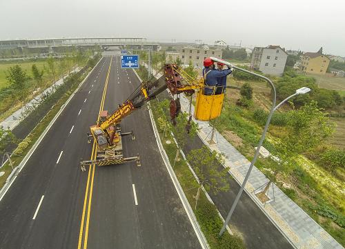 6月20日,长兴太湖新城路灯维护人员在对新安装的LED路灯进行检查。新华社记者 徐昱 摄 |