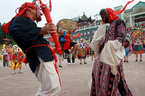 6月21日,在广西壮族自治区河池市环江毛南族自治县,群众在表演傩面舞。新华社发(卢增令 摄)
