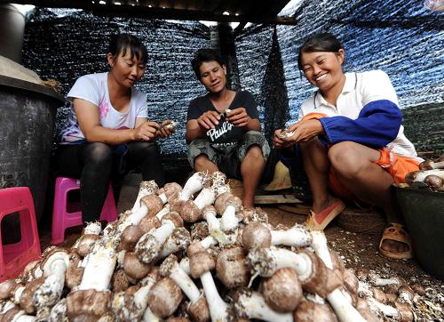 6月25日,文山市塘子寨的苗族群众在清理巴西蘑菇。云南省文山市文祥巴西蘑菇种植农民专业合作社引进巴西蘑菇(姬松茸)种植培育技术,指导34户苗族群众利用大棚种植生态巴西蘑菇,经加工后的产品畅销国内外市场。仅种植巴西蘑菇一项,文山市塘子寨的苗族群众户均年创收近30000元。新华社记者 杨宗友 摄