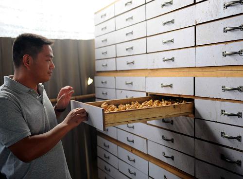 6月25日,文山市文祥巴西蘑菇种植农民专业合作社的管理人员在查看烘烤的巴西蘑菇。新华社记者 杨宗友 摄 |