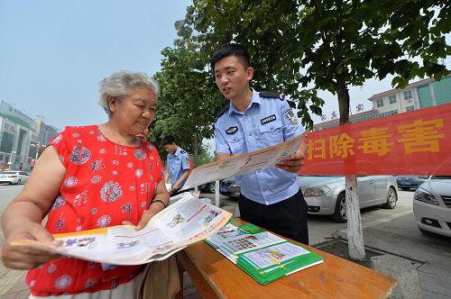 6月26日,河北省唐县公安局民警在禁毒宣传活动上向群众发放禁毒宣传材料。当日是国际禁毒日,河北省唐县公安局开展“远离毒品 珍爱生命”禁毒日主题宣传活动,增强公众对毒品危害性、违法性的认识,倡导公众远离毒品、珍爱生命。新华社记者 朱旭东 摄