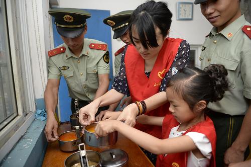 6月28日,驻宁波海警33043艇的海警官兵与宁波市北仑区小港街道红联社区的志愿者一起在社区内的养老爱心食堂为社区老人备餐。新华社记者 鞠焕宗 摄