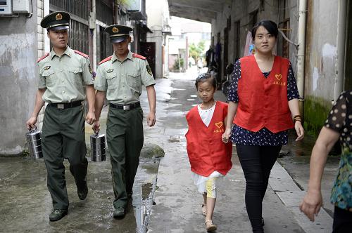 6月28日,驻宁波海警33043艇的海警官兵与宁波市北仑区小港街道红联社区的志愿者一起为社区老人送餐。新华社记者 鞠焕宗 摄 |