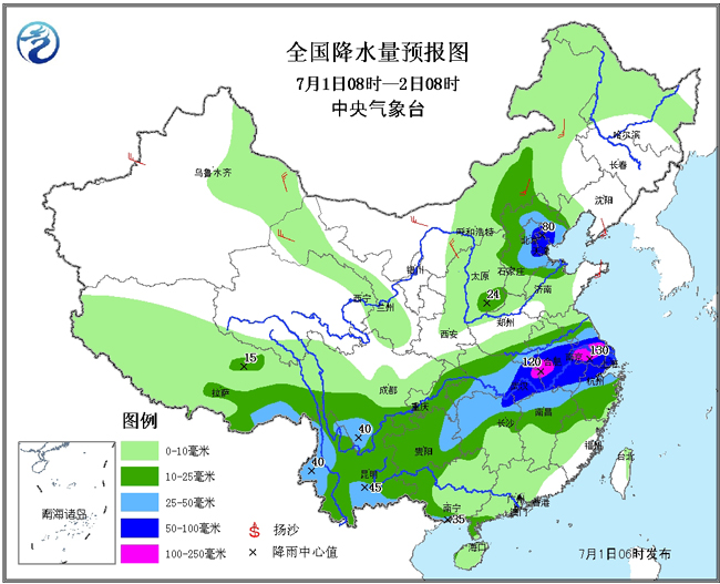 中央气象台7月1日06时发布暴雨蓝色预警:预计,7月1日08时至2日08时,贵州东部、江南北部、江汉东部、江淮大部、西藏东南部、四川南部、云南西部和南部、广西南部沿海等地有大雨或暴雨,其中,湖北东北部、安徽大别山区、江苏南部等地的局部地区有大暴雨(100~130毫米);另外,北京大部、河北中东部、天津大部、山东西北部等地有大雨,局地暴雨(50~80毫米);上述局部地区并伴有短时雷雨大风或冰雹等强对流天气。