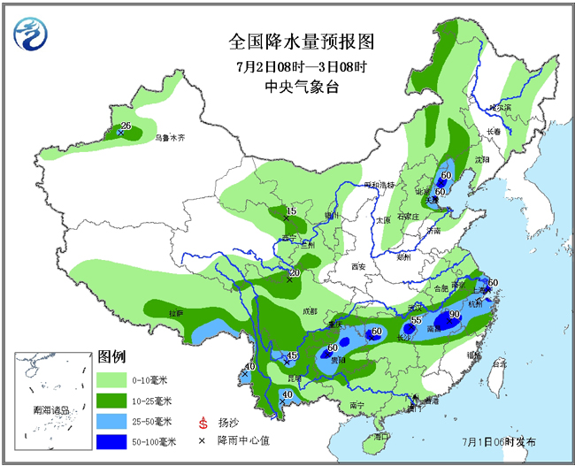 据气象专家介绍,长江中下游地区本轮强降雨将一直持续到7月6日。由于江南、西南地区前期已持续降雨,多地已出现山体滑坡和洪涝等灾害。未来一周需密切关注雨情、汛情,加强防范中小河流洪水及山洪地质灾害。 此外,华北地区未来这场降雨强度较大,北京、天津和河北等地需加强城乡低洼区、地下排水设施以及山区地质灾害易发区等的巡查监测,防范强降雨可能引发的城乡内涝、山洪及滑坡等灾害。 未来三天具体预报 7月1日08时至2日08时,西藏东南部、四川西南部、重庆、云南西部和南部、贵州东部、广西南部沿海、江南北部、江汉东部、江淮大部、华北东部等地有大雨或暴雨,其中,湖北东北部、安徽大别山区、江苏南部等地局地有大暴雨(100~130毫米);上述局地并伴有短时强降水和雷雨大风等强对流天气。