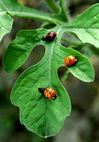 在济源绿色农业精品园区内,人工培育的异色瓢虫在作物的茎叶上(6月30日摄)。新华社记者 朱祥 摄