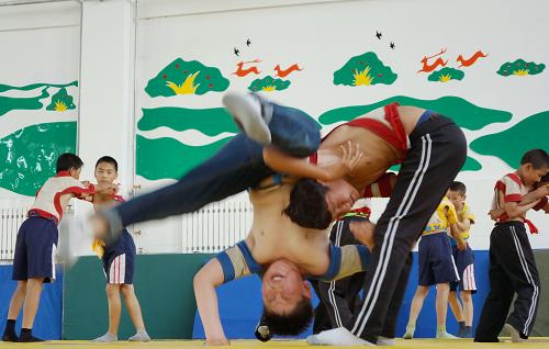 7月1日,阿木古郎第一小学学生正在进行搏克(蒙古式摔跤)训练。近年来,位于呼伦贝尔草原腹地的内蒙古新巴尔虎左旗以民族特色为根基,优先发展教育,构建了文明礼仪、书法艺术、民风民俗等课程体系,为草原培育全面发展的人才。新华社记者 邹俭朴 摄