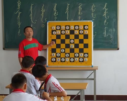 7月1日,阿木古郎第一小学教师苏尤拉扎希给学生上蒙古象棋课。新华社记者 邹俭朴 摄