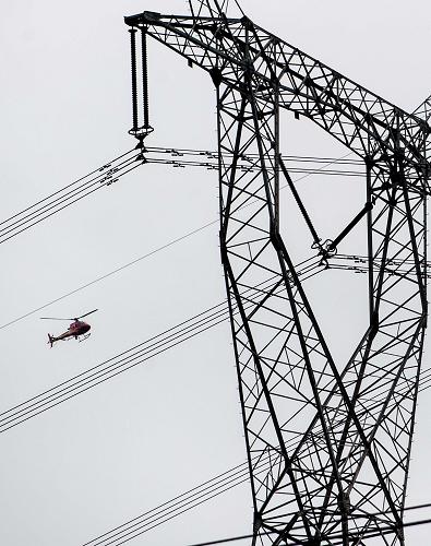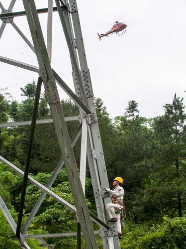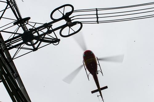 7月3日,巡视直升机配合地面巡护人员对±800千伏复奉线输电线路设备进行巡查。当日,国家电网重庆市电力公司组织300多名技术骨干,对西电东送工程“大动脉”——±800千伏复奉线重庆段开展空地联合特巡。±800千伏复奉线于2010年7月投入运行,最大输送功率为640万千瓦,线路全长1907公里,途经四川、重庆、湖北、上海等8省市。新华社记者 刘潺 摄