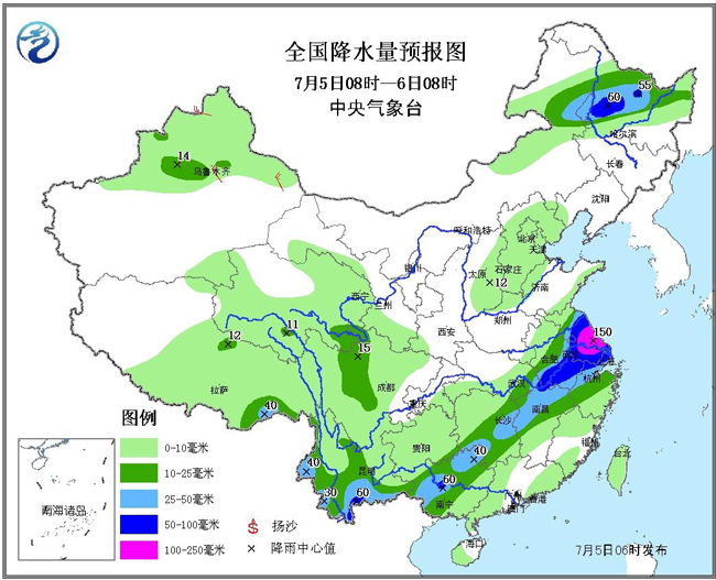 据中央气象台消息,7月5日,江淮、江南东北部和西南部、广西东北部和西部、云南南部和西部等地有大到暴雨,部分地区有大暴雨(100~150毫米)。中央气象台5日06时继续发布暴雨黄色预警。 东北多阵性降雨。5~7日,内蒙古中东部、东北地区中北部等地多阵性降雨,其中,黑龙江西南部和东北部、内蒙古东部等地的局部地区有大到暴雨(50~80毫米),并伴有短时雷雨大风等强对流天气。 未来三天具体预报: 5日08时至6日08时,江苏大部、上海、安徽南部、浙江北部、江西北部、湖南中部和西南部、广西东北部和西部、云南南部和西部、黑龙江中部和西南部等地有大雨或暴雨,其中,江苏中南部的部分地区有大暴雨(100~150毫米);上述地区局地并伴有短时雷雨大风等强对流天气。