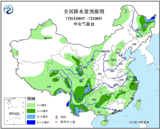 6日08时至7日08时,黑龙江中东部、江淮东部、江南东北部和中部、西南地区大部、广西北部、青藏高原中东部等地的部分地区有中到大雨,黑龙江东北部、云南西部等地的局地有暴雨(50~70毫米);上述局地并伴有短时雷雨大风等强对流天气。